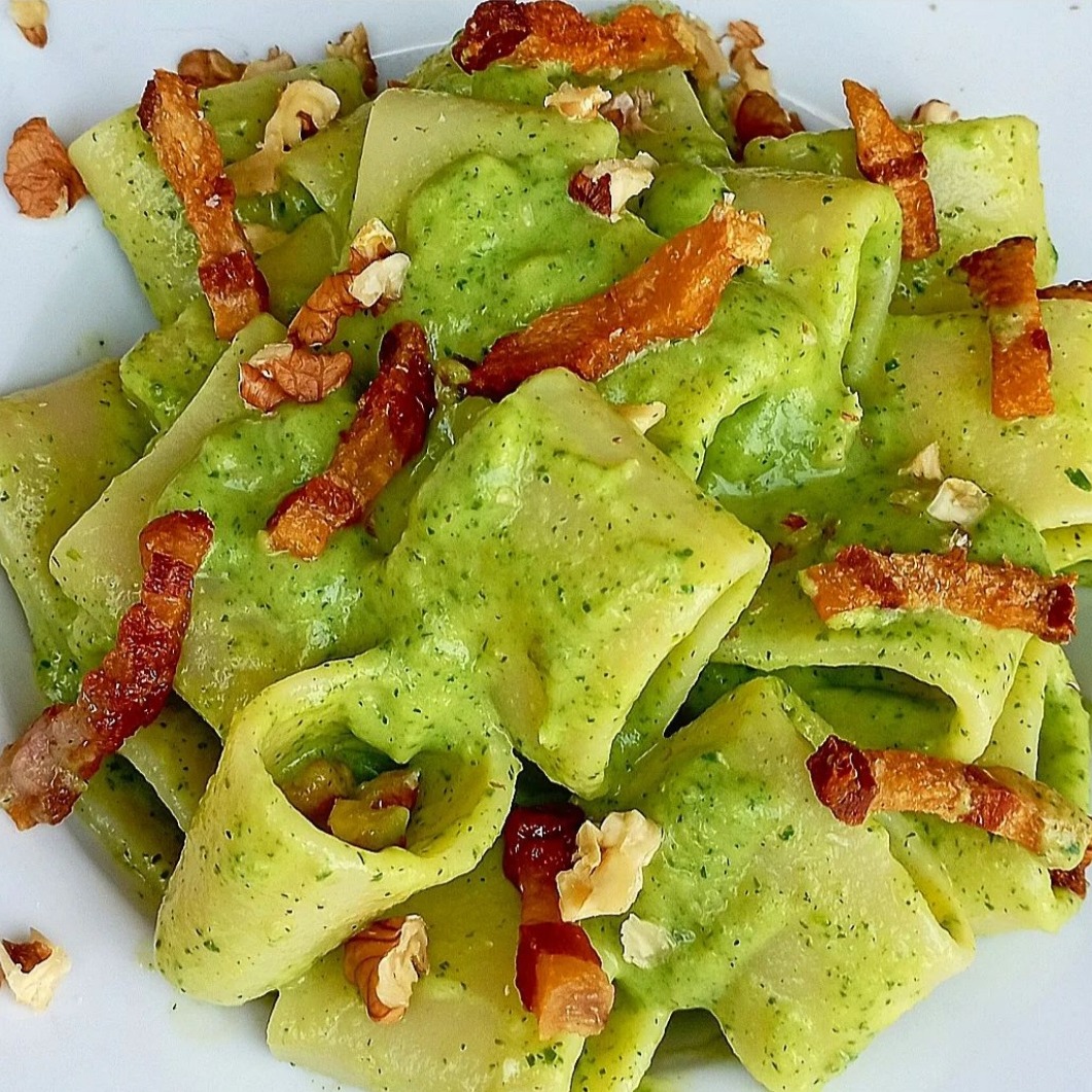 Mezzi Paccheri Gnocca , Pesto genovese al basilico e pancetta fresca a cubetti